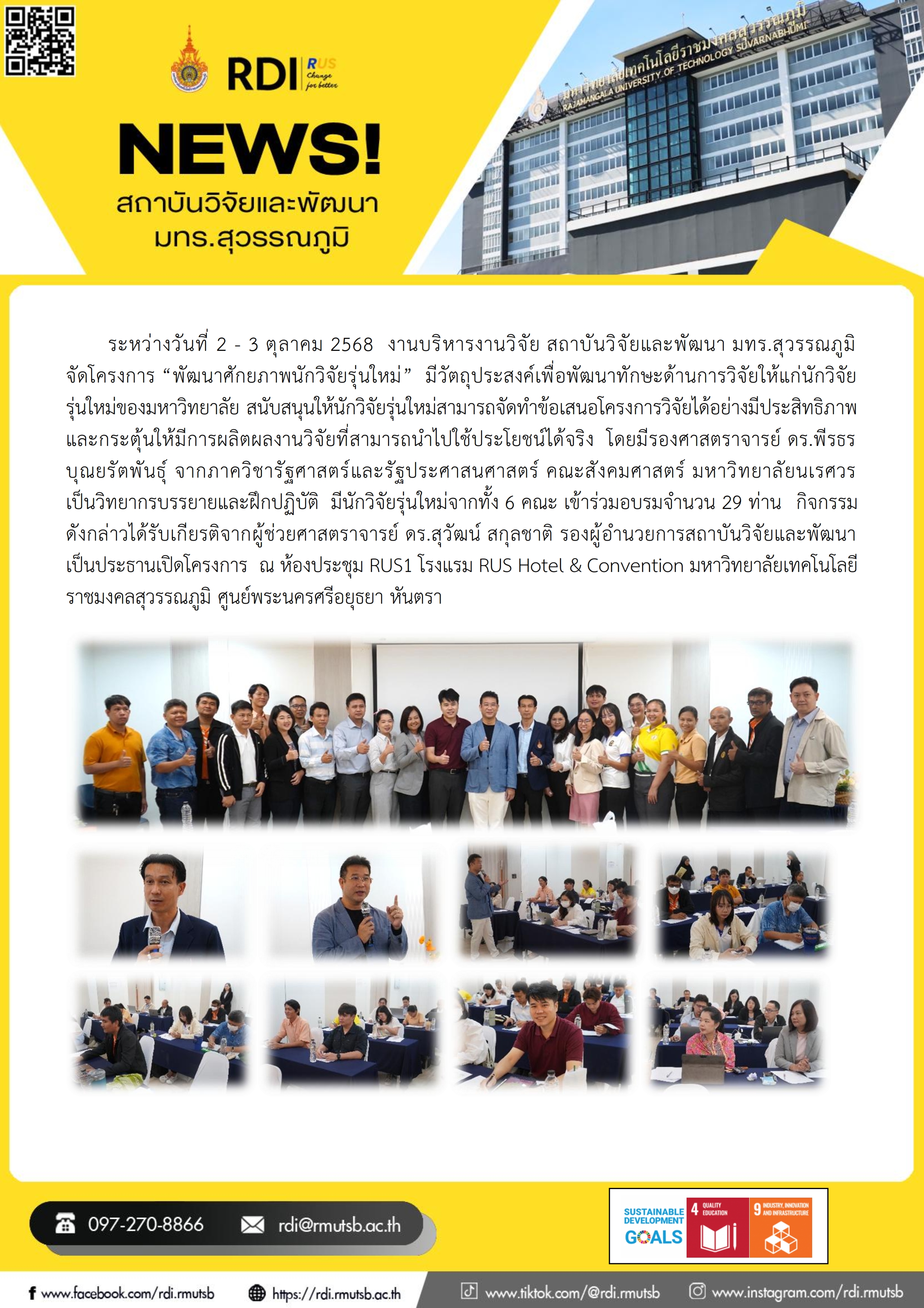 ระหว่างวันที่ 2 - 3 ตุลาคม 2568 งานบริหารงานวิจัย สถาบันวิจัยและพัฒนา มทร.สุวรรณภูมิ จัดโครงการ “พัฒนาศักยภาพนักวิจัยรุ่นใหม่”มีวัตถุประสงค์เพื่อพัฒนาทักษะด้านการวิจัยให้แก่นักวิจัยรุ่นใหม่ของมหาวิทยาลัย สนับสนุนให้นักวิจัยรุ่นใหม่สามารถจัดทำข้อเสนอโครงการวิจัยได้อย่างมีประสิทธิภาพ และกระตุ้นให้มีการผลิตผลงานวิจัยที่สามารถนำไปใช้ประโยชน์ได้จริง โดยมีรองศาสตราจารย์ ดร.พีรธร บุณยรัตพันธุ์ จากภาควิชารัฐศาสตร์และรัฐประศาสนศาสตร์ คณะสังคมศาสตร์ มหาวิทยาลัยนเรศวร เป็นวิทยากรบรรยายและฝึกปฏิบัติ มีนักวิจัยรุ่นใหม่จากทั้ง 6 คณะ เข้าร่วมอบรมจำนวน 29 ท่าน กิจกรรมดังกล่าวได้รับเกียรติจากผู้ช่วยศาสตราจารย์ ดร.สุวัฒน์ สกุลชาติ รองผู้อำนวยการสถาบันวิจัยและพัฒนา เป็นประธานเปิดโครงการ ณ ห้องประชุม RUS1 โรงแรม RUS Hotel & Convention มหาวิทยาลัยเทคโนโลยีราชมงคลสุวรรณภูมิ ศูนย์พระนครศรีอยุธยา หันตรา