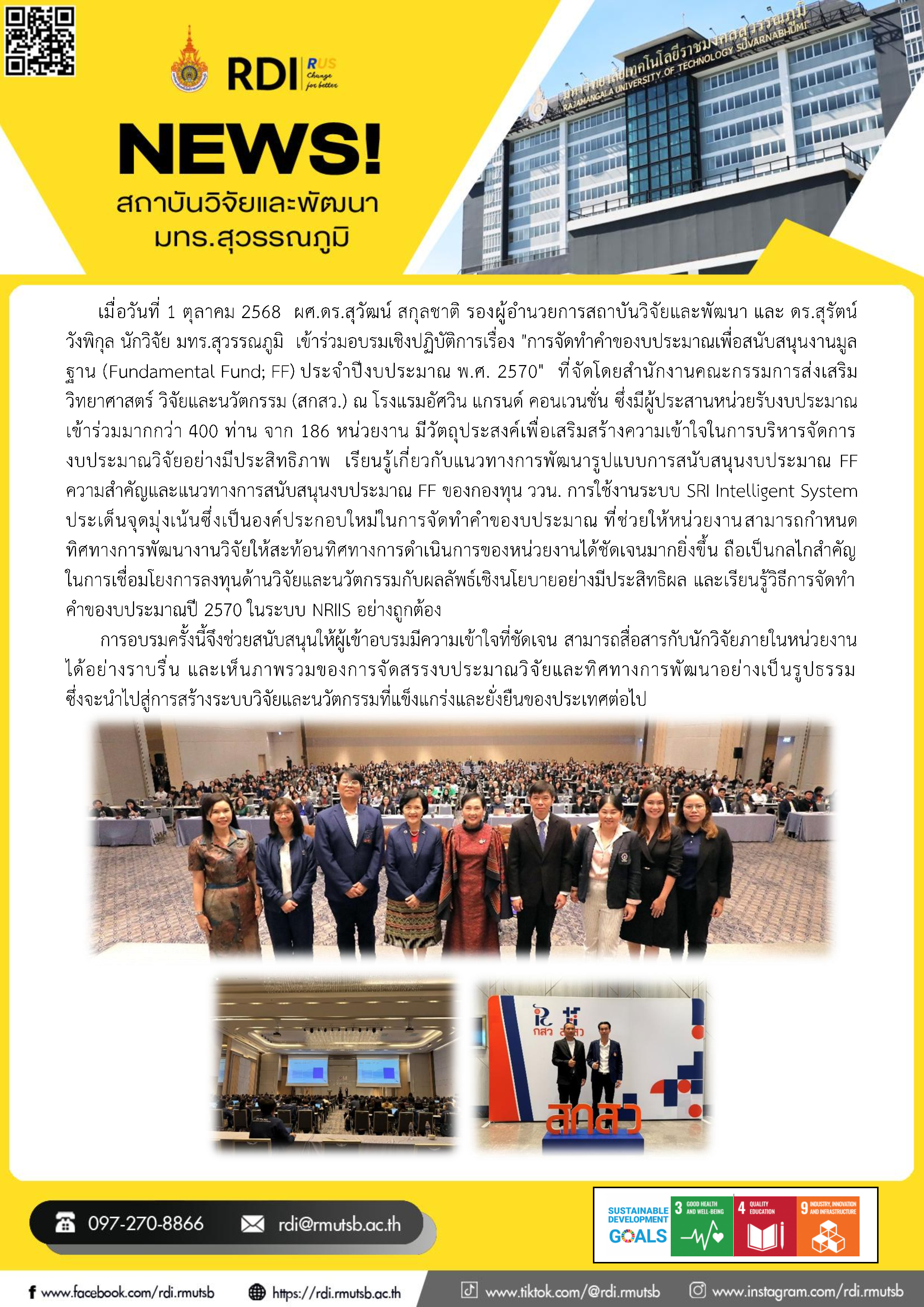 เมื่อวันที่ 1 ตุลาคม 2568 ผศ.ดร.สุวัฒน์ สกุลชาติ รองผู้อำนวยการสถาบันวิจัยและพัฒนา และ ดร.สุรัตน์ วังพิกุล นักวิจัย มทร.สุวรรณภูมิ เข้าร่วมอบรมเชิงปฏิบัติการเรื่อง "การจัดทำคำของบประมาณเพื่อสนับสนุนงานมูลฐาน (Fundamental Fund; FF) ประจำปีงบประมาณ พ.ศ. 2570" ที่จัดโดยสำนักงานคณะกรรมการส่งเสริมวิทยาศาสตร์ วิจัยและนวัตกรรม (สกสว.) ณ โรงแรมอัศวิน แกรนด์ คอนเวนชั่น กรุงเทพมหานคร ซึ่งมีผู้ประสานหน่วยรับงบประมาณเข้าร่วมมากกว่า 400 ท่าน จาก 186 หน่วยงาน มีวัตถุประสงค์เพื่อเสริมสร้างความเข้าใจในการบริหารจัดการงบประมาณวิจัยอย่างมีประสิทธิภาพ เรียนรู้เกี่ยวกับแนวทางการพัฒนารูปแบบการสนับสนุนงบประมาณ FF ความสำคัญและแนวทางการสนับสนุนงบประมาณ FF ของกองทุน ววน. การใช้งานระบบ SRI Intelligent System ประเด็นจุดมุ่งเน้นซึ่งเป็นองค์ประกอบใหม่ในการจัดทำคำของบประมาณ ที่ช่วยให้หน่วยงานสามารถกำหนดทิศทางการพัฒนางานวิจัยให้สะท้อนทิศทางการดำเนินการของหน่วยงานได้ชัดเจนมากยิ่งขึ้น ถือเป็นกลไกสำคัญในการเชื่อมโยงการลงทุนด้านวิจัยและนวัตกรรมกับผลลัพธ์เชิงนโยบายอย่างมีประสิทธิผล และเรียนรู้วิธีการจัดทำ คำของบประมาณปี 2570 ในระบบ NRIIS อย่างถูกต้อง