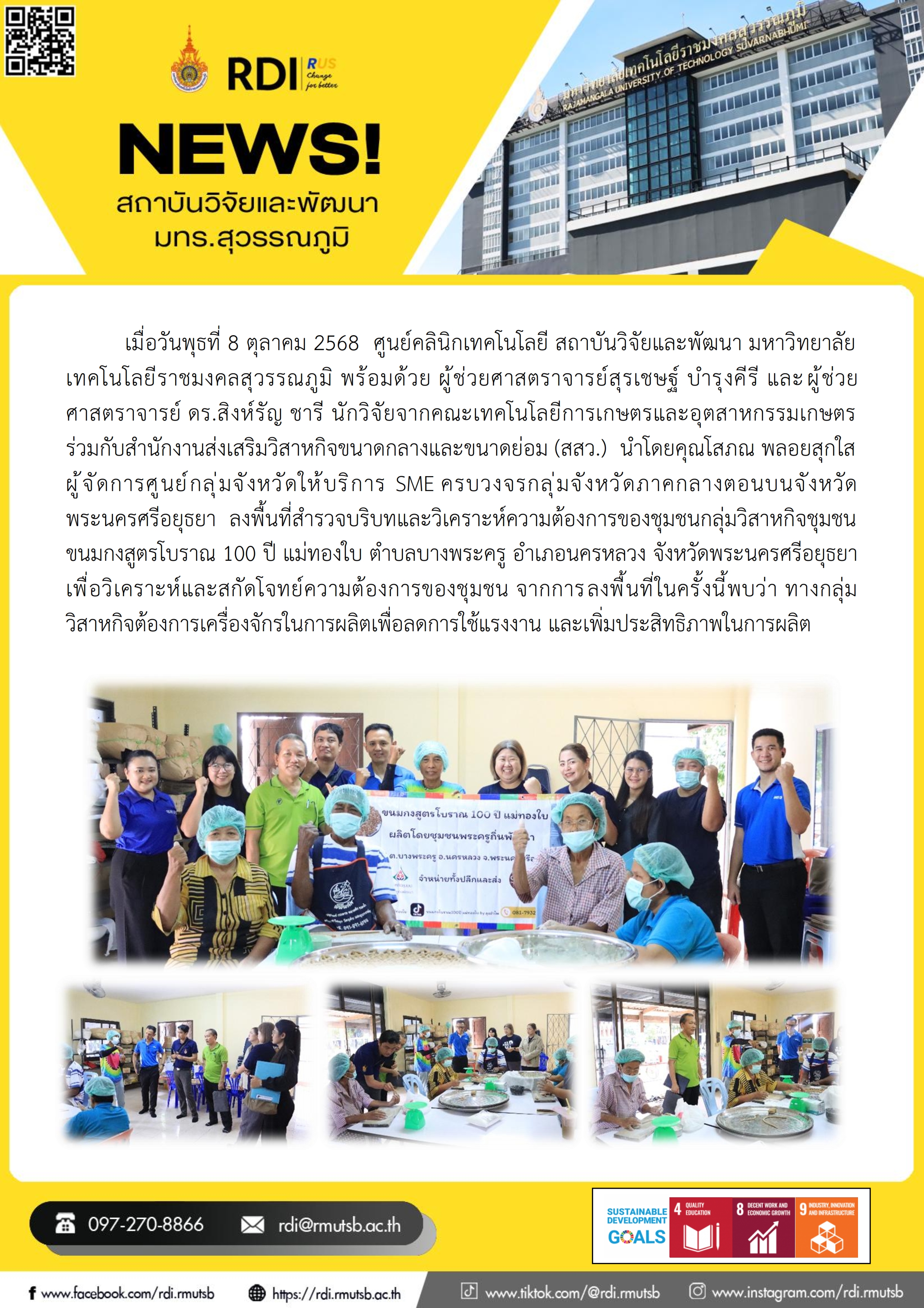 เมื่อวันพุธที่ 8 ตุลาคม 2568 ศูนย์คลินิกเทคโนโลยี สถาบันวิจัยและพัฒนา มหาวิทยาลัยเทคโนโลยีราชมงคลสุวรรณภูมิ พร้อมด้วย ผู้ช่วยศาสตราจารย์สุรเชษฐ์ บำรุงคีรี และผู้ช่วยศาสตราจารย์ ดร.สิงห์รัญ ชารี นักวิจัยจากคณะเทคโนโลยีการเกษตรและอุตสาหกรรมเกษตร ร่วมกับสำนักงานส่งเสริมวิสาหกิจขนาดกลางและขนาดย่อม (สสว.) นำโดยคุณโสภณ พลอยสุกใส ผู้จัดการศูนย์กลุ่มจังหวัดให้บริการ SME ครบวงจรกลุ่มจังหวัดภาคกลางตอนบนจังหวัดพระนครศรีอยุธยา ลงพื้นที่สำรวจบริบทและวิเคราะห์ความต้องการของชุมชนกลุ่มวิสาหกิจชุมชนขนมกงสูตรโบราณ 100 ปี แม่ทองใบ ตำบลบางพระครู อำเภอนครหลวง จังหวัดพระนครศรีอยุธยา เพื่อวิเคราะห์และสกัดโจทย์ความต้องการของชุมชน จากการลงพื้นที่ในครั้งนี้พบว่า ทางกลุ่มวิสาหกิจต้องการเครื่องจักรในการผลิตเพื่อลดการใช้แรงงาน และเพิ่มประสิทธิภาพในการผลิต