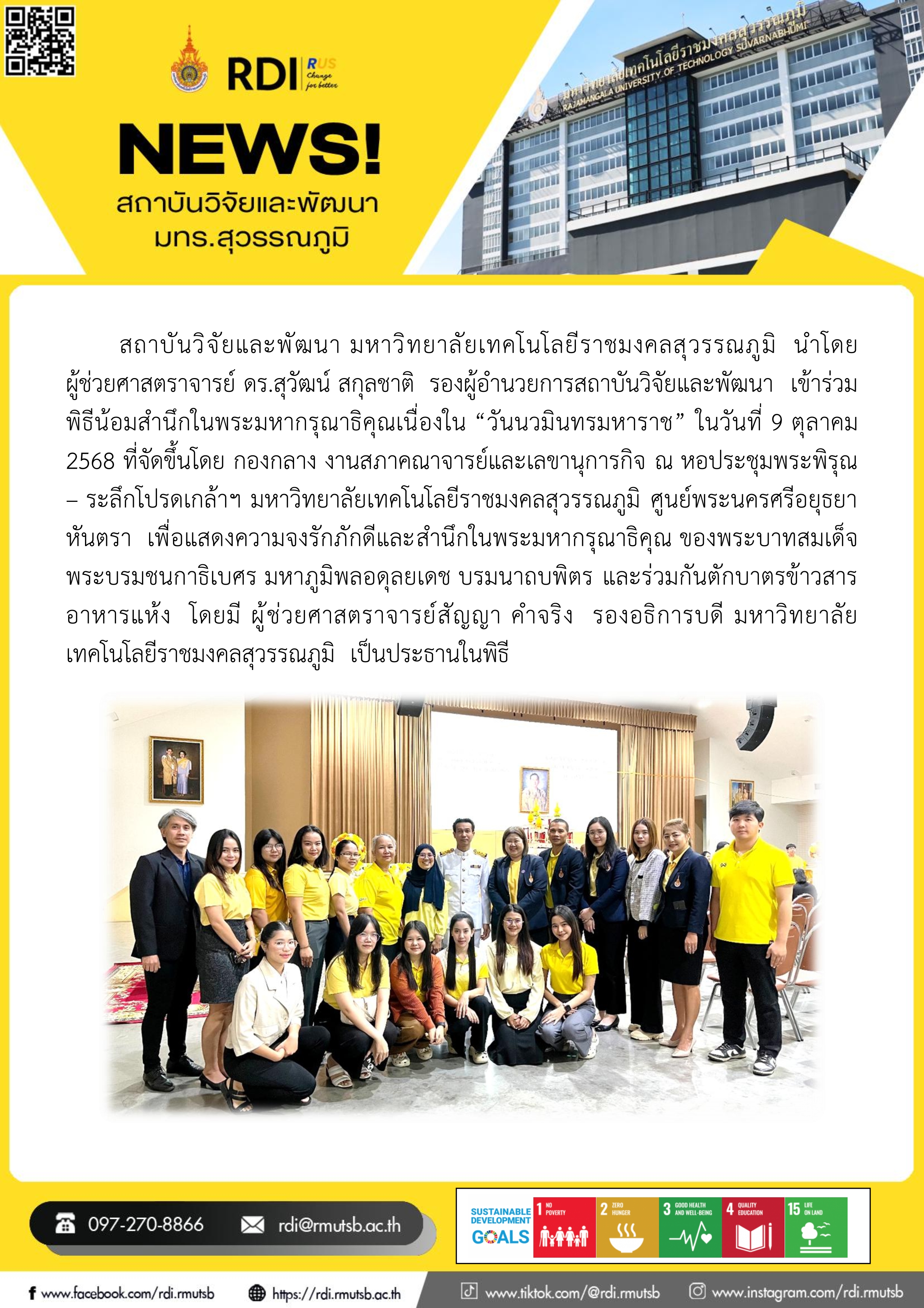 สถาบันวิจัยและพัฒนา มหาวิทยาลัยเทคโนโลยีราชมงคลสุวรรณภูมิ นำโดย ผู้ช่วยศาสตราจารย์ ดร.สุวัฒน์ สกุลชาติ รองผู้อำนวยการสถาบันวิจัยและพัฒนา เข้าร่วมพิธีน้อมสำนึกในพระมหากรุณาธิคุณเนื่องใน “วันนวมินทรมหาราช” ในวันที่ 9 ตุลาคม 2568 ที่จัดขึ้นโดย กองกลาง งานสภาคณาจารย์และเลขานุการกิจ ณ หอประชุมพระพิรุณ – ระลึกโปรดเกล้าฯ มหาวิทยาลัยเทคโนโลยีราชมงคลสุวรรณภูมิ ศูนย์พระนครศรีอยุธยา หันตรา เพื่อแสดงความจงรักภักดีและสำนึกในพระมหากรุณาธิคุณ ของพระบาทสมเด็จพระบรมชนกาธิเบศร มหาภูมิพลอดุลยเดช บรมนาถบพิตร และร่วมกันตักบาตรข้าวสารอาหารแห้ง โดยมี ผู้ช่วยศาสตราจารย์สัญญา คำจริง รองอธิการบดี มหาวิทยาลัยเทคโนโลยีราชมงคลสุวรรณภูมิ เป็นประธานในพิธี