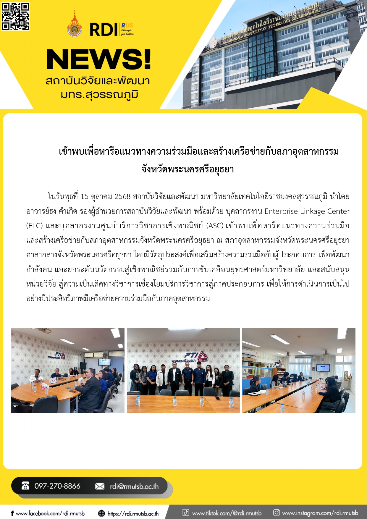 ในวันพุธที่ 15 ตุลาคม 2568 สถาบันวิจัยและพัฒนา มหาวิทยาลัยเทคโนโลยีราชมงคลสุวรรณภูมิ นำโดย อาจารย์ธง คำเกิด รองผู้อำนวยการสถาบันวิจัยและพัฒนา พร้อมด้วย บุคลากรงาน Enterprise Linkage Center (ELC) และบุคลากรงานศูนย์บริการวิชาการเชิงพาณิชย์ (ASC) เข้าพบเพื่อหารือแนวทางความร่วมมือและสร้างเครือข่ายกับสภาอุตสาหกรรมจังหวัดพระนครศรีอยุธยา ณ สภาอุตสาหกรรมจังหวัดพระนครศรีอยุธยา ศาลากลางจังหวัดพระนครศรีอยุธยา โดยมีวัตถุประสงค์เพื่อเสริมสร้างความร่วมมือกับผู้ประกอบการ เพื่อพัฒนากำลังคน และยกระดับนวัตกรรมสู่เชิงพาณิชย์ร่วมกับการขับเคลื่อนยุทธศาสตร์มหาวิทยาลัย และสนับสนุนหน่วยวิจัย สู่ความเป็นเลิศทางวิชาการเชื่อมโยงบริการวิชาการสู่ภาคประกอบการ เพื่อให้การดำเนินการเป็นไปอย่างมีประสิทธิภาพมีเครือข่ายความร่วมมือกับภาคอุตสาหกรรม