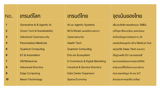 ข้อมูล: Global Innovation Index (GII) 2025 โดย WIPO, Top 10 Emerging Technologies of 2025 โดย World Economic Forum (WEF), Top Technology Trends for 2025 โดยบริษัทวิจัยและที่ปรึกษาชั้นนำ, The AI Index Report 2025 โดย Stanford University (HAI), 10 Technologies to Watch 2025 โดย NSTDA, 2025 Startup Trends / Focus Areas โดย NIA, กรอบประเด็นยุทธศาสตร์/ทิศทางวิจัยและนวัตกรรมไทย ปีงบประมาณ พ.ศ. 2568 โดย MHESI, รายงาน Global Innovation Tracker 2025 โดย WIPO