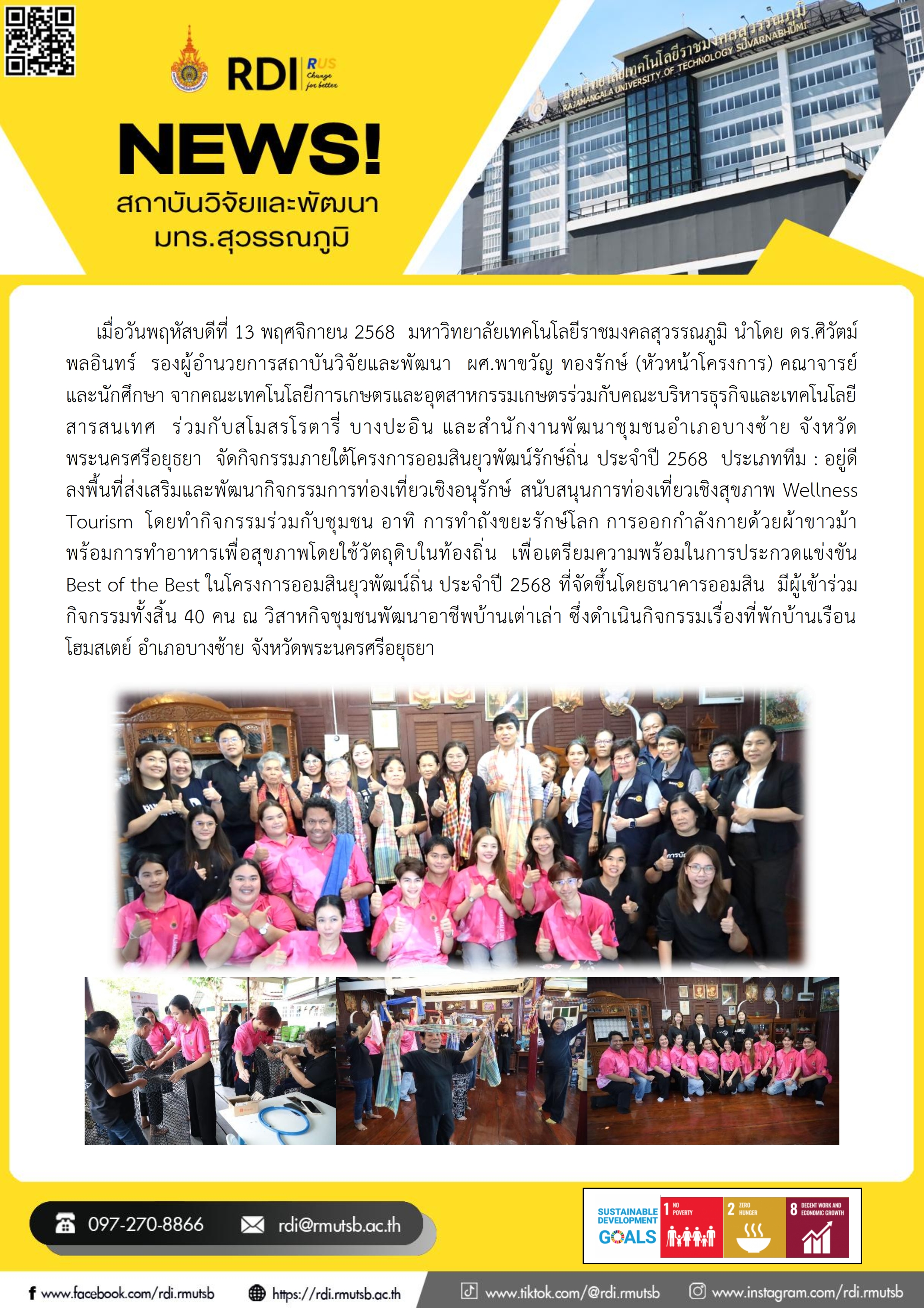 เมื่อวันพฤหัสบดีที่ 13 พฤศจิกายน 2568 มหาวิทยาลัยเทคโนโลยีราชมงคลสุวรรณภูมิ นำโดย ดร.ศิวัตม์ พลอินทร์ รองผู้อำนวยการสถาบันวิจัยและพัฒนา ผศ.พาขวัญ ทองรักษ์ (หัวหน้าโครงการ) คณาจารย์และนักศึกษา จากคณะเทคโนโลยีการเกษตรและอุตสาหกรรมเกษตรร่วมกับคณะบริหารธุรกิจและเทคโนโลยีสารสนเทศ ร่วมกับสโมสรโรตารี่ บางปะอิน และสำนักงานพัฒนาชุมชนอำเภอบางซ้าย จังหวัดพระนครศรีอยุธยา จัดกิจกรรมภายใต้โครงการออมสินยุวพัฒน์รักษ์ถิ่น ประจำปี 2568 ประเภททีม : อยู่ดี ลงพื้นที่ส่งเสริมและพัฒนากิจกรรมการท่องเที่ยวเชิงอนุรักษ์ สนับสนุนการท่องเที่ยวเชิงสุขภาพ Wellness Tourism โดยทำกิจกรรมร่วมกับชุมชน อาทิ การทำถังขยะรักษ์โลก การออกกำลังกายด้วยผ้าขาวม้า พร้อมการทำอาหารเพื่อสุขภาพโดยใช้วัตถุดิบในท้องถิ่น เพื่อเตรียมความพร้อมในการประกวดแข่งขัน Best of the Best ในโครงการออมสินยุวพัฒน์ถิ่น ประจำปี 2568 ที่จัดขึ้นโดยธนาคารออมสิน มีผู้เข้าร่วมกิจกรรมทั้งสิ้น 40 คน ณ วิสาหกิจชุมชนพัฒนาอาชีพบ้านเต่าเล่า ซึ่งดำเนินกิจกรรมเรื่องที่พักบ้านเรือนโฮมสเตย์ อำเภอบางซ้าย จังหวัดพระนครศรีอยุธยา