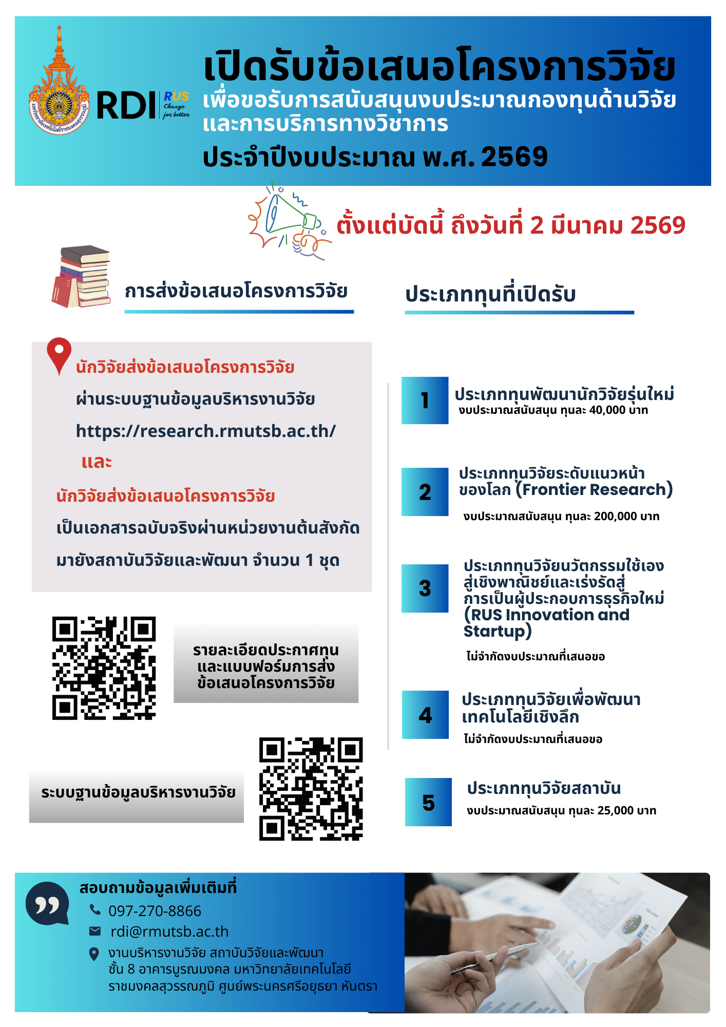 เปิดรับข้อเสนอโครงการวิจัย งบกองทุนด้านวิจัยและการบริการทางวิชาการ ประจำปีงบประมาณ 2569