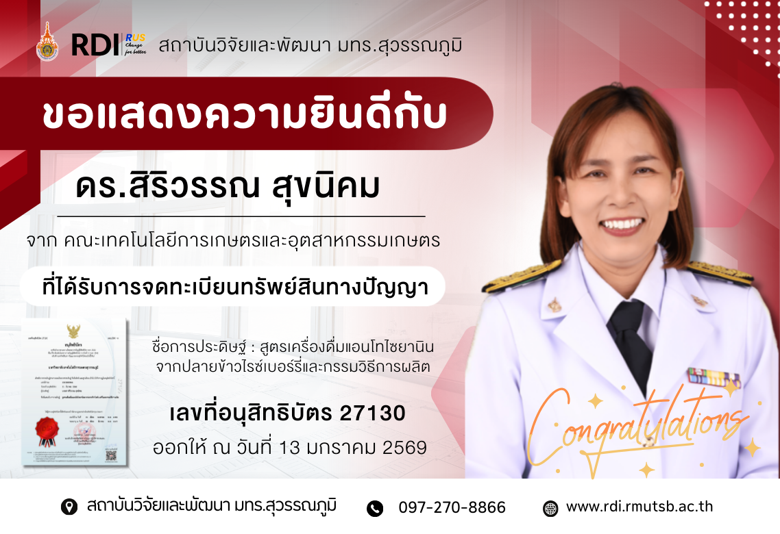 ขอแสดงความยินดีกับ ดร.สิริวรรณ สุขนิคม ที่ได้รับการจดทะเบียนทรัพย์สินทางปัญญา