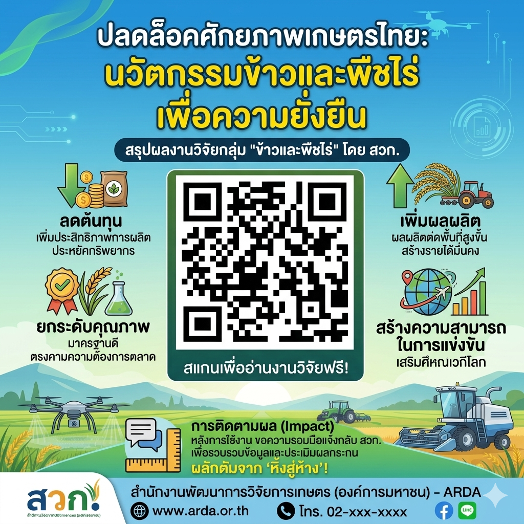 การติดตามผล: เมื่อนำผลงานวิจัยไปใช้ประโยชน์แล้ว ขอความร่วมมือแจ้งกลับมายัง สำนักงานพัฒนาการวิจัยการเกษตร (องค์การมหาชน) อย่างเป็นทางการ เพื่อรวบรวมข้อมูลและประเมินผลกระทบ (Impact) ที่เกิดขึ้นจริงหลังการใช้งาน การเผยแพร่นี้ถือเป็นก้าวสำคัญในการผลักดันงานวิจัยจาก "หิ้งสู่ห้าง" เพื่อให้เกิดประโยชน์สูงสุดต่อภาคการเกษตรของไทยอย่างยั่งยืน