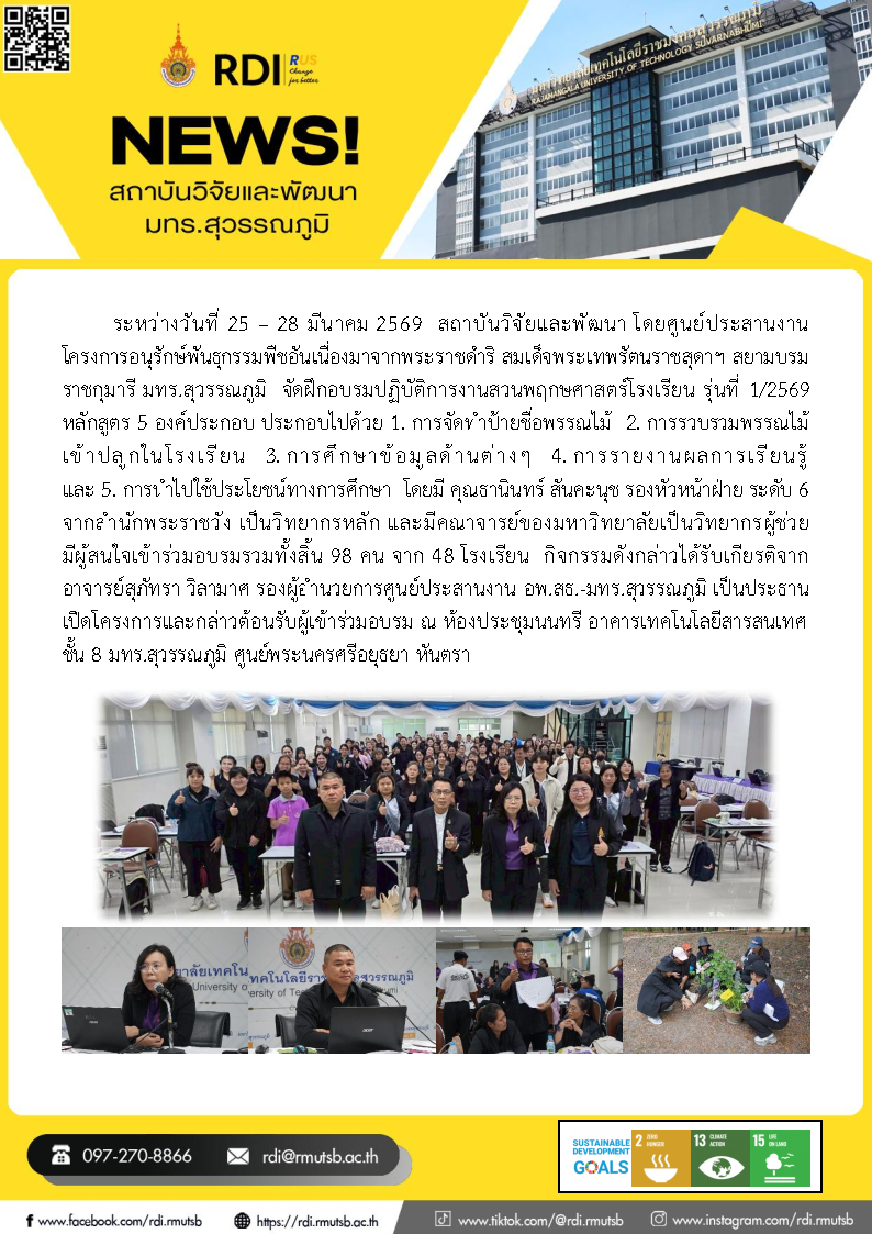 ระหว่างวันที่ 25 – 28 มีนาคม 2569 สถาบันวิจัยและพัฒนา โดยศูนย์ประสานงานโครงการอนุรักษ์พันธุกรรมพืชอันเนื่องมาจากพระราชดําริ สมเด็จพระเทพรัตนราชสุดาฯ สยามบรมราชกุมารี มทร.สุวรรณภูมิ จัดฝึกอบรมปฏิบัติการงานสวนพฤกษศาสตร์โรงเรียน รุ่นที่ 1/2569 หลักสูตร 5 องค์ประกอบ ประกอบไปด้วย 1. การจัดทำป้ายชื่อพรรณไม้ 2. การรวบรวมพรรณไม้เข้าปลูกในโรงเรียน 3. การศึกษาข้อมูลด้านต่างๆ 4. การรายงานผลการเรียนรู้ และ 5. การนำไปใช้ประโยชน์ทางการศึกษา โดยมี คุณธานินทร์ สันคะนุช รองหัวหน้าฝ่าย ระดับ 6 จากสำนักพระราชวัง เป็นวิทยากรหลัก และมีคณาจารย์ของมหาวิทยาลัยเป็นวิทยากรผู้ช่วย มีผู้สนใจเข้าร่วมอบรมรวมทั้งสิ้น 98 คน จาก 48 โรงเรียน กิจกรรมดังกล่าวได้รับเกียรติจาก อาจารย์สุภัทรา วิลามาศ รองผู้อำนวยการศูนย์ประสานงาน อพ.สธ.-มทร.สุวรรณภูมิ เป็นประธานเปิดโครงการและกล่าวต้อนรับผู้เข้าร่วมอบรม ณ ห้องประชุมนนทรี อาคารเทคโนโลยีสารสนเทศ ชั้น 8 มทร.สุวรรณภูมิ ศูนย์พระนครศรีอยุธยา หันตรา