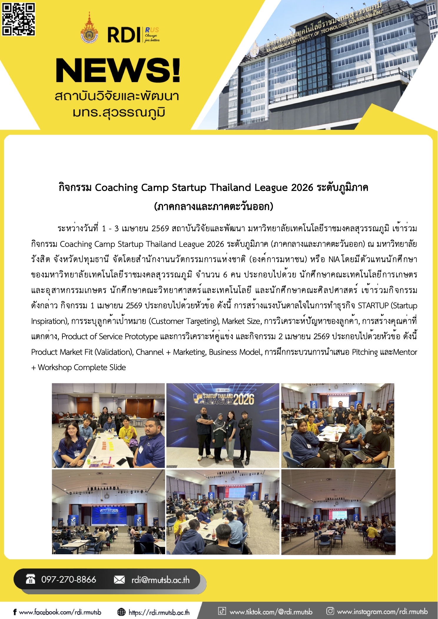 ระหว่างวันที่ 1 - 3 เมษายน 2569 สถาบันวิจัยและพัฒนา มหาวิทยาลัยเทคโนโลยีราชมงคลสุวรรณภูมิ เข้าร่วม กิจกรรม Coaching Camp Startup Thailand League 2026 ระดับภูมิภาค (ภาคกลางและภาคตะวันออก) ณ มหาวิทยาลัยรังสิต จังหวัดปทุมธานี จัดโดยสำนักงานนวัตกรรมการแห่งชาติ (องค์การมหาชน) หรือ NIA โดยมีตัวแทนนักศึกษาของมหาวิทยาลัยเทคโนโลยีราชมงคลสุวรรณภูมิ จำนวน 6 คน ประกอบไปด้วย นักศึกษาคณะเทคโนโลยีการเกษตรและอุสาหกรรมเกษตร นักศึกษาคณะวิทยาศาสตร์และเทคโนโลยี และนักศึกษาคณะศิลปศาสตร์ เข้าร่วมกิจกรรมดังกล่าว กิจกรรม 1 เมษายน 2569 ประกอบไปด้วยหัวข้อ ดังนี้ การสร้างแรงบันดาลใจในการทำธุรกิจ STARTUP (Startup Inspiration), การระบุลูกค้าเป้าหมาย (Customer Targeting), Market Size, การวิเคราะห์ปัญหาของลูกค้า, การสร้างคุณค่าที่แตกต่าง, Product of Service Prototype และการวิเคราะห์คู่แข่ง และกิจกรรม 2 เมษายน 2569 ประกอบไปด้วยหัวข้อ ดังนี้ Product Market Fit (Validation), Channel + Marketing, Business Model, การฝึกกระบวนการนำเสนอ Pitching และMentor + Workshop Complete Slide