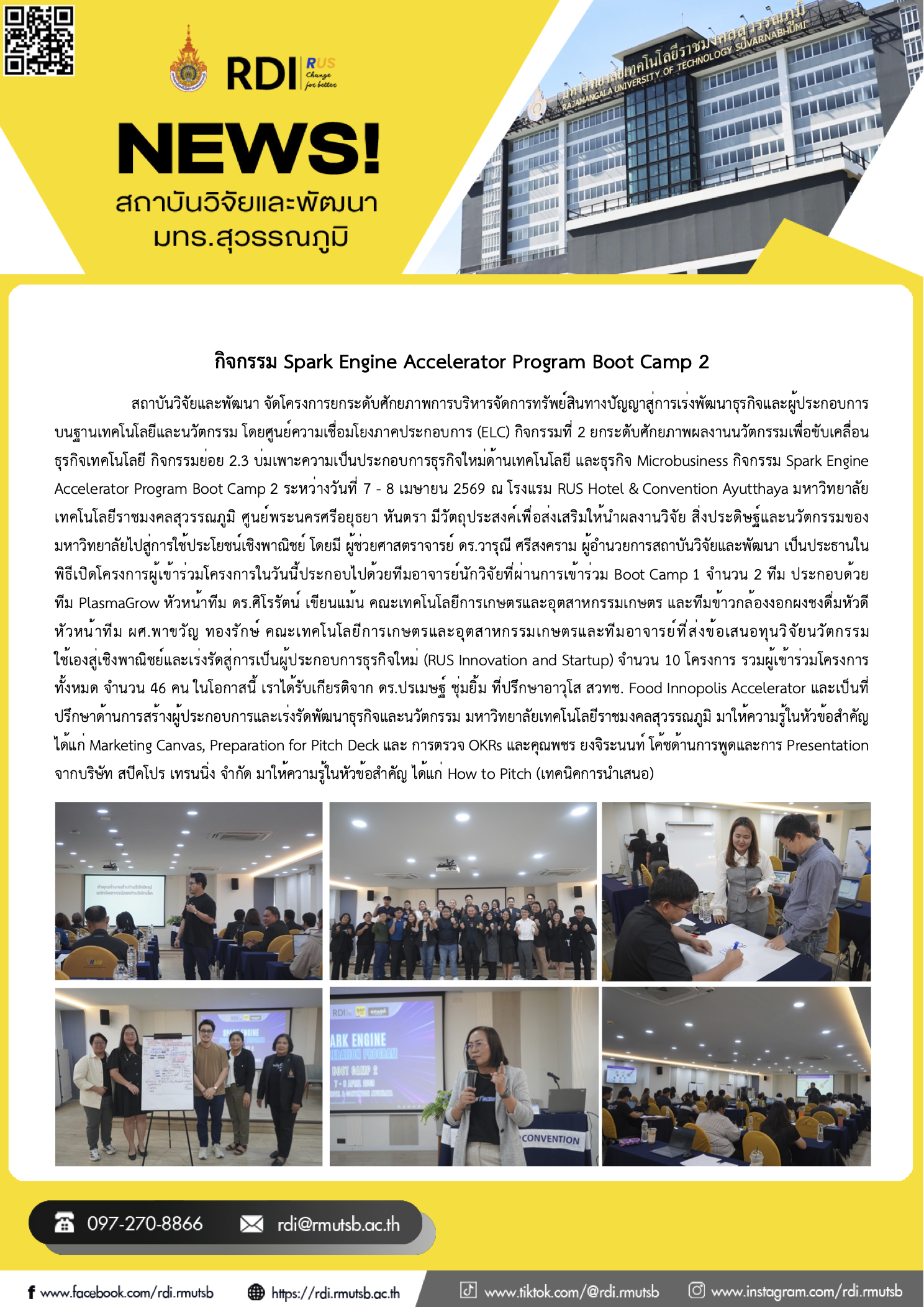 สถาบันวิจัยและพัฒนา จัดโครงการยกระดับศักยภาพการบริหารจัดการทรัพย์สินทางปัญญาสู่การเร่งพัฒนาธุรกิจและผู้ประกอบการบนฐานเทคโนโลยีและนวัตกรรม โดยศูนย์ความเชื่อมโยงภาคประกอบการ (ELC) กิจกรรมที่ 2 ยกระดับศักยภาพผลงานนวัตกรรมเพื่อขับเคลื่อนธุรกิจเทคโนโลยี กิจกรรมย่อย 2.3 บ่มเพาะความเป็นประกอบการธุรกิจใหม่ด้านเทคโนโลยี และธุรกิจ Microbusiness กิจกรรม Spark Engine Accelerator Program Boot Camp 2 ระหว่างวันที่ 7 - 8 เมษายน 2569 ณ โรงแรม RUS Hotel & Convention Ayutthaya มหาวิทยาลัยเทคโนโลยีราชมงคลสุวรรณภูมิ ศูนย์พระนครศรีอยุธยา หันตรา มีวัตถุประสงค์เพื่อส่งเสริมให้นำผลงานวิจัย สิ่งประดิษฐ์และนวัตกรรมของมหาวิทยาลัยไปสู่การใช้ประโยชน์เชิงพาณิชย์ โดยมี ผู้ช่วยศาสตราจารย์ ดร.วารุณี ศรีสงคราม ผู้อำนวยการสถาบันวิจัยและพัฒนา เป็นประธานในพิธีเปิดโครงการผู้เข้าร่วมโครงการในวันนี้ประกอบไปด้วยทีมอาจารย์นักวิจัยที่ผ่านการเข้าร่วม Boot Camp 1 จำนวน 2 ทีม ประกอบด้วย ทีม PlasmaGrow หัวหน้าทีม ดร.ศิโรรัตน์ เขียนแม้น คณะเทคโนโลยีการเกษตรและอุตสาหกรรมเกษตร และทีมข้าวกล้องงอกผงชงดื่มหัวดี หัวหน้าทีม ผศ.พาขวัญ ทองรักษ์ คณะเทคโนโลยีการเกษตรและอุตสาหกรรมเกษตรและทีมอาจารย์ที่ส่งข้อเสนอทุนวิจัยนวัตกรรมใช้เองสู่เชิงพาณิชย์และเร่งรัดสู่การเป็นผู้ประกอบการธุรกิจใหม่ (RUS Innovation and Startup) จำนวน 10 โครงการ รวมผู้เข้าร่วมโครงการทั้งหมด จำนวน 46 คน ในโอกาสนี้ เราได้รับเกียรติจาก ดร.ปรเมษฐ์ ชุ่มยิ้ม ที่ปรึกษาอาวุโส สวทช. Food Innopolis Accelerator และเป็นที่ปรึกษาด้านการสร้างผู้ประกอบการและเร่งรัดพัฒนาธุรกิจและนวัตกรรม มหาวิทยาลัยเทคโนโลยีราชมงคลสุวรรณภูมิ มาให้ความรู้ในหัวข้อสำคัญ ได้แก่ Marketing Canvas, Preparation for Pitch Deck และ การตรวจ OKRs และคุณพชร ยงจิระนนท์ โค้ชด้านการพูดและการ Presentation จากบริษัท สปีคโปร เทรนนิ่ง จำกัด มาให้ความรู้ในหัวข้อสำคัญ ได้แก่ How to Pitch (เทคนิคการนำเสนอ)