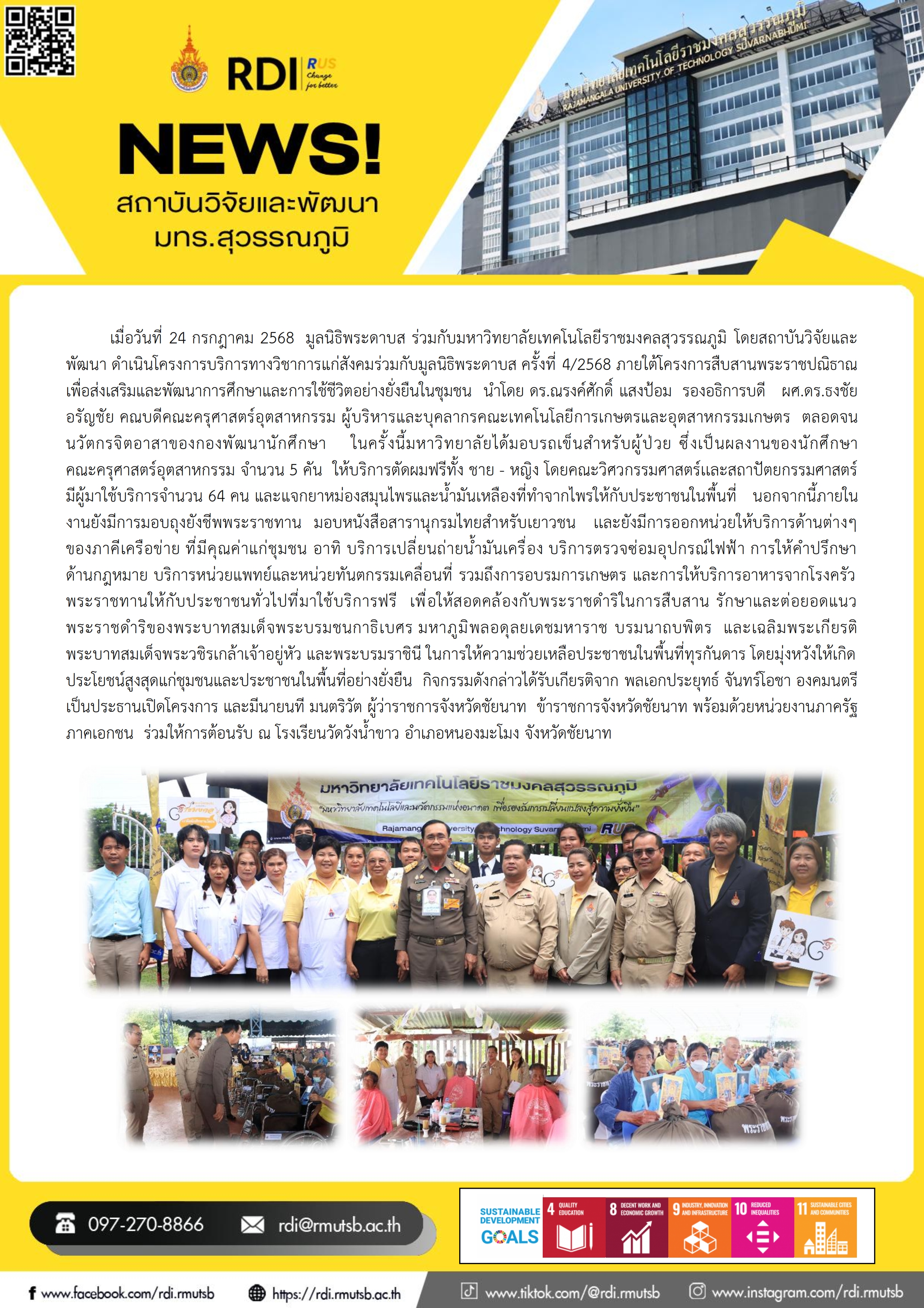 เมื่อวันที่ 24 กรกฎาคม 2568  มูลนิธิพระดาบส ร่วมกับมหาวิทยาลัยเทคโนโลยีราชมงคลสุวรรณภูมิ โดยสถาบันวิจัยและพัฒนา ดำเนินโครงการบริการทางวิชาการแก่สังคมร่วมกับมูลนิธิพระดาบส ครั้งที่ 4/2568 ภายใต้โครงการสืบสานพระราชปณิธาณ เพื่อส่งเสริมและพัฒนาการศึกษาและการใช้ชีวิตอย่างยั่งยืนในชุมชน  นำโดย ดร.ณรงค์ศักดิ์ แสงป้อม  รองอธิการบดี   ผศ.ดร.ธงชัย อรัญชัย คณบดีคณะครุศาสตร์อุตสาหกรรม ผู้บริหารและบุคลากรคณะเทคโนโลยีการเกษตรและอุตสาหกรรมเกษตร  ตลอดจน นวัตกรจิตอาสาของกองพัฒนานักศึกษา    ในครั้งนี้มหาวิทยาลัยได้มอบรถเข็นสำหรับผู้ป่วย ซึ่งเป็นผลงานของนักศึกษา  คณะครุศาสตร์อุตสาหกรรม จำนวน 5 คัน  ให้บริการตัดผมฟรีทั้ง ชาย - หญิง โดยคณะวิศวกรรมศาสตร์เเละสถาปัตยกรรมศาสตร์  มีผู้มาใช้บริการจำนวน 64 คน และแจกยาหม่องสมุนไพรและน้ำมันเหลืองที่ทำจากไพรให้กับประชาชนในพื้นที่   นอกจากนี้ภายในงานยังมีการมอบถุงยังชีพพระราชทาน  มอบหนังสือสารานุกรมไทยสำหรับเยาวชน   เเละยังมีการออกหน่วยให้บริการด้านต่างๆ  ของภาคีเครือข่าย ที่มีคุณค่าแก่ชุมชน อาทิ บริการเปลี่ยนถ่ายน้ำมันเครื่อง บริการตรวจซ่อมอุปกรณ์ไฟฟ้า การให้คำปรึกษาด้านกฎหมาย บริการหน่วยแพทย์และหน่วยทันตกรรมเคลื่อนที่ รวมถึงการอบรมการเกษตร และการให้บริการอาหารจากโรงครัวพระราชทานให้กับประชาชนทั่วไปที่มาใช้บริการฟรี  เพื่อให้สอดคล้องกับพระราชดำริในการสืบสาน รักษาและต่อยอดแนวพระราชดำริของพระบาทสมเด็จพระบรมชนกาธิเบศร มหาภูมิพลอดุลยเดชมหาราช บรมนาถบพิตร  และเฉลิมพระเกียรติพระบาทสมเด็จพระวชิรเกล้าเจ้าอยู่หัว และพระบรมราชินี ในการให้ความช่วยเหลือประชาชนในพื้นที่ทุรกันดาร โดยมุ่งหวังให้เกิดประโยชน์สูงสุดแก่ชุมชนและประชาชนในพื้นที่อย่างยั่งยืน  กิจกรรมดังกล่าวได้รับเกียรติจาก พลเอกประยุทธ์ จันทร์โอชา องคมนตรี เป็นประธานเปิดโครงการ และมีนายนที มนตริวัต ผู้ว่าราชการจังหวัดชัยนาท  ข้าราชการจังหวัดชัยนาท พร้อมด้วยหน่วยงานภาครัฐ ภาคเอกชน  ร่วมให้การต้อนรับ ณ โรงเรียนวัดวังน้ำขาว อำเภอหนองมะโมง จังหวัดชัยนาท