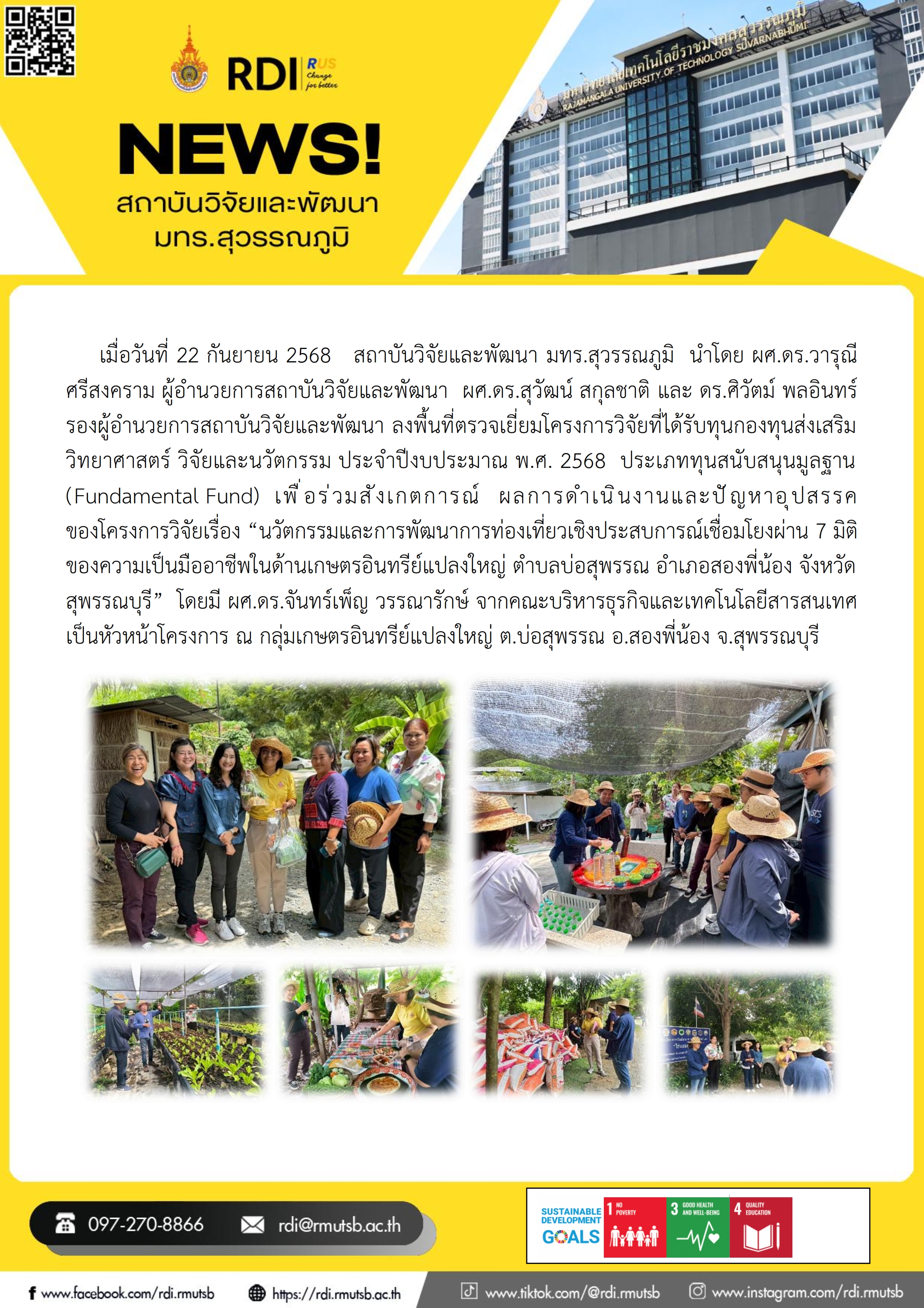 เมื่อวันที่ 22 กันยายน 2568 สถาบันวิจัยและพัฒนา มทร.สุวรรณภูมิ นำโดย ผศ.ดร.วารุณี ศรีสงคราม ผู้อำนวยการสถาบันวิจัยและพัฒนา ผศ.ดร.สุวัฒน์ สกุลชาติ และ ดร.ศิวัตม์ พลอินทร์ รองผู้อำนวยการสถาบันวิจัยและพัฒนา ลงพื้นที่ตรวจเยี่ยมโครงการวิจัยที่ได้รับทุนกองทุนส่งเสริมวิทยาศาสตร์ วิจัยและนวัตกรรม ประจำปีงบประมาณ พ.ศ. 2568 ประเภททุนสนับสนุนมูลฐาน (Fundamental Fund) เพื่อร่วมสังเกตการณ์ ผลการดำเนินงานและปัญหาอุปสรรค ของโครงการวิจัยเรื่อง “นวัตกรรมและการพัฒนาการท่องเที่ยวเชิงประสบการณ์เชื่อมโยงผ่าน 7 มิติ ของความเป็นมืออาชีพในด้านเกษตรอินทรีย์แปลงใหญ่ ตําบลบ่อสุพรรณ อําเภอสองพี่น้อง จังหวัดสุพรรณบุรี” โดยมี ผศ.ดร.จันทร์เพ็ญ วรรณารักษ์ จากคณะบริหารธุรกิจและเทคโนโลยีสารสนเทศ เป็นหัวหน้าโครงการ ณ กลุ่มเกษตรอินทรีย์แปลงใหญ่ ต.บ่อสุพรรณ อ.สองพี่น้อง จ.สุพรรณบุรี