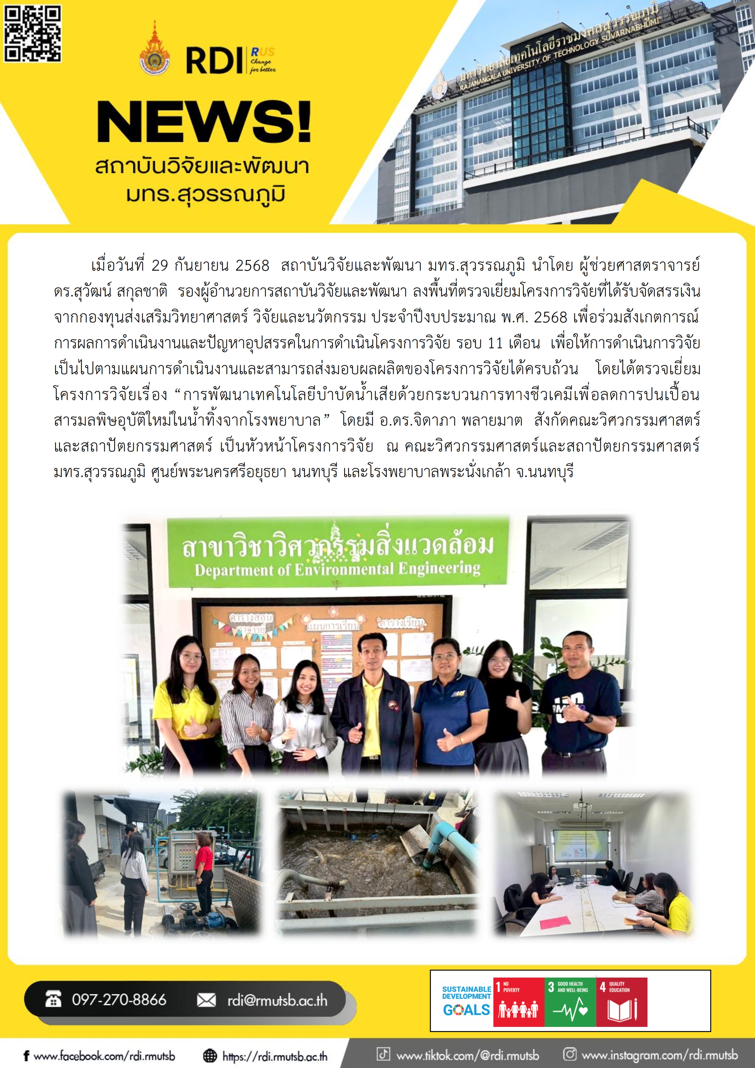 เมื่อวันที่ 29 กันยายน 2568 สถาบันวิจัยและพัฒนา มทร.สุวรรณภูมิ นำโดย ผู้ช่วยศาสตราจารย์ ดร.สุวัฒน์ สกุลชาติ รองผู้อำนวยการสถาบันวิจัยและพัฒนา ลงพื้นที่ตรวจเยี่ยมโครงการวิจัยที่ได้รับจัดสรรเงินจากกองทุนส่งเสริมวิทยาศาสตร์ วิจัยและนวัตกรรม ประจำปีงบประมาณ พ.ศ. 2568 เพื่อร่วมสังเกตการณ์ การผลการดำเนินงานและปัญหาอุปสรรคในการดำเนินโครงการวิจัย รอบ 11 เดือน เพื่อให้การดำเนินการวิจัยเป็นไปตามแผนการดำเนินงานและสามารถส่งมอบผลผลิตของโครงการวิจัยได้ครบถ้วน โดยได้ตรวจเยี่ยมโครงการวิจัยเรื่อง “การพัฒนาเทคโนโลยีบำบัดน้ำเสียด้วยกระบวนการทางชีวเคมีเพื่อลดการปนเปื้อนสารมลพิษอุบัติใหม่ในน้ำทิ้งจากโรงพยาบาล” โดยมี อ.ดร.จิดาภา พลายมาต สังกัดคณะวิศวกรรมศาสตร์และสถาปัตยกรรมศาสตร์ เป็นหัวหน้าโครงการวิจัย ณ คณะวิศวกรรมศาสตร์และสถาปัตยกรรมศาสตร์ มทร.สุวรรณภูมิ ศูนย์พระนครศรีอยุธยา นนทบุรี และโรงพยาบาลพระนั่งเกล้า จ.นนทบุรี