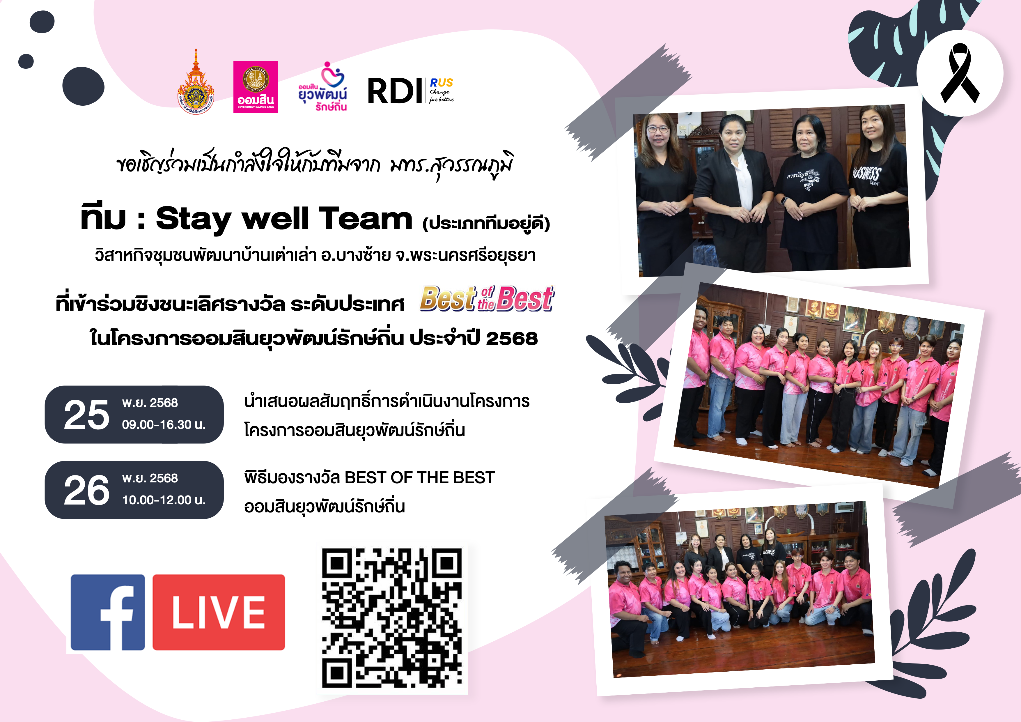ขอเชิญร่วมเป็นกำลังใจให้กับทีม Stay well Team ที่เข้าร่วมชิงชนะเลิศรางวัลระดับประเทศ ในโครงการออมสินยุวพัฒน์รักษ์ถิ่น