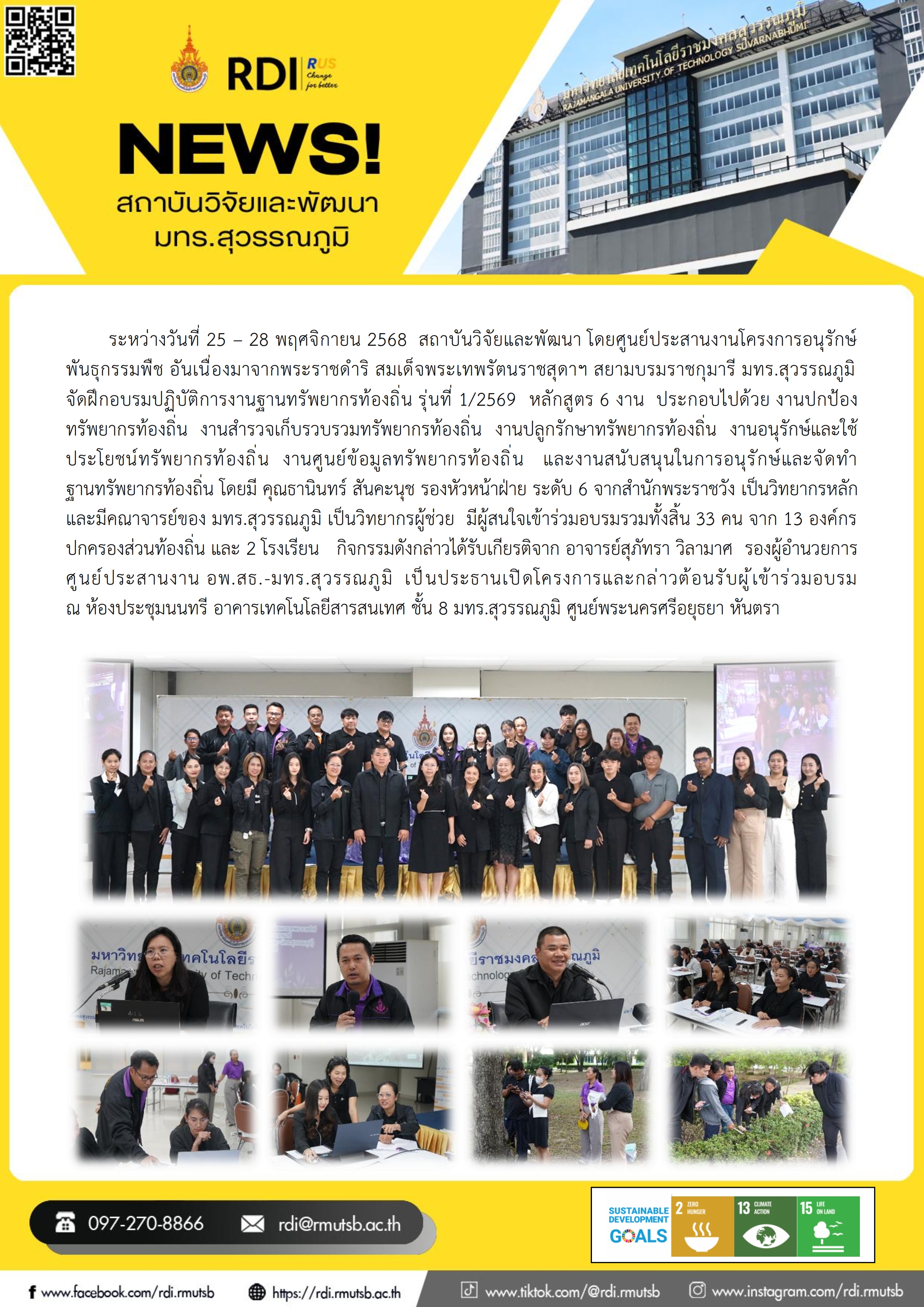 ระหว่างวันที่ 25 – 28 พฤศจิกายน 2568 สถาบันวิจัยและพัฒนา โดยศูนย์ประสานงานโครงการอนุรักษ์พันธุกรรมพืช อันเนื่องมาจากพระราชดําริ สมเด็จพระเทพรัตนราชสุดาฯ สยามบรมราชกุมารี มทร.สุวรรณภูมิ จัดฝึกอบรมปฏิบัติการงานฐานทรัพยากรท้องถิ่น รุ่นที่ 1/2569 หลักสูตร 6 งาน ประกอบไปด้วย งานปกป้องทรัพยากรท้องถิ่น งานสำรวจเก็บรวบรวมทรัพยากรท้องถิ่น งานปลูกรักษาทรัพยากรท้องถิ่น งานอนุรักษ์และใช้ประโยชน์ทรัพยากรท้องถิ่น งานศูนย์ข้อมูลทรัพยากรท้องถิ่น และงานสนับสนุนในการอนุรักษ์และจัดทำฐานทรัพยากรท้องถิ่น โดยมี คุณธานินทร์ สันคะนุช รองหัวหน้าฝ่าย ระดับ 6 จากสำนักพระราชวัง เป็นวิทยากรหลัก และมีคณาจารย์ของ มทร.สุวรรณภูมิ เป็นวิทยากรผู้ช่วย มีผู้สนใจเข้าร่วมอบรมรวมทั้งสิ้น 33 คน จาก 13 องค์กรปกครองส่วนท้องถิ่น และ 2 โรงเรียน กิจกรรมดังกล่าวได้รับเกียรติจาก อาจารย์สุภัทรา วิลามาศ รองผู้อำนวยการศูนย์ประสานงาน อพ.สธ.-มทร.สุวรรณภูมิ เป็นประธานเปิดโครงการและกล่าวต้อนรับผู้เข้าร่วมอบรม ณ ห้องประชุมนนทรี อาคารเทคโนโลยีสารสนเทศ ชั้น 8 มทร.สุวรรณภูมิ ศูนย์พระนครศรีอยุธยา หันตรา