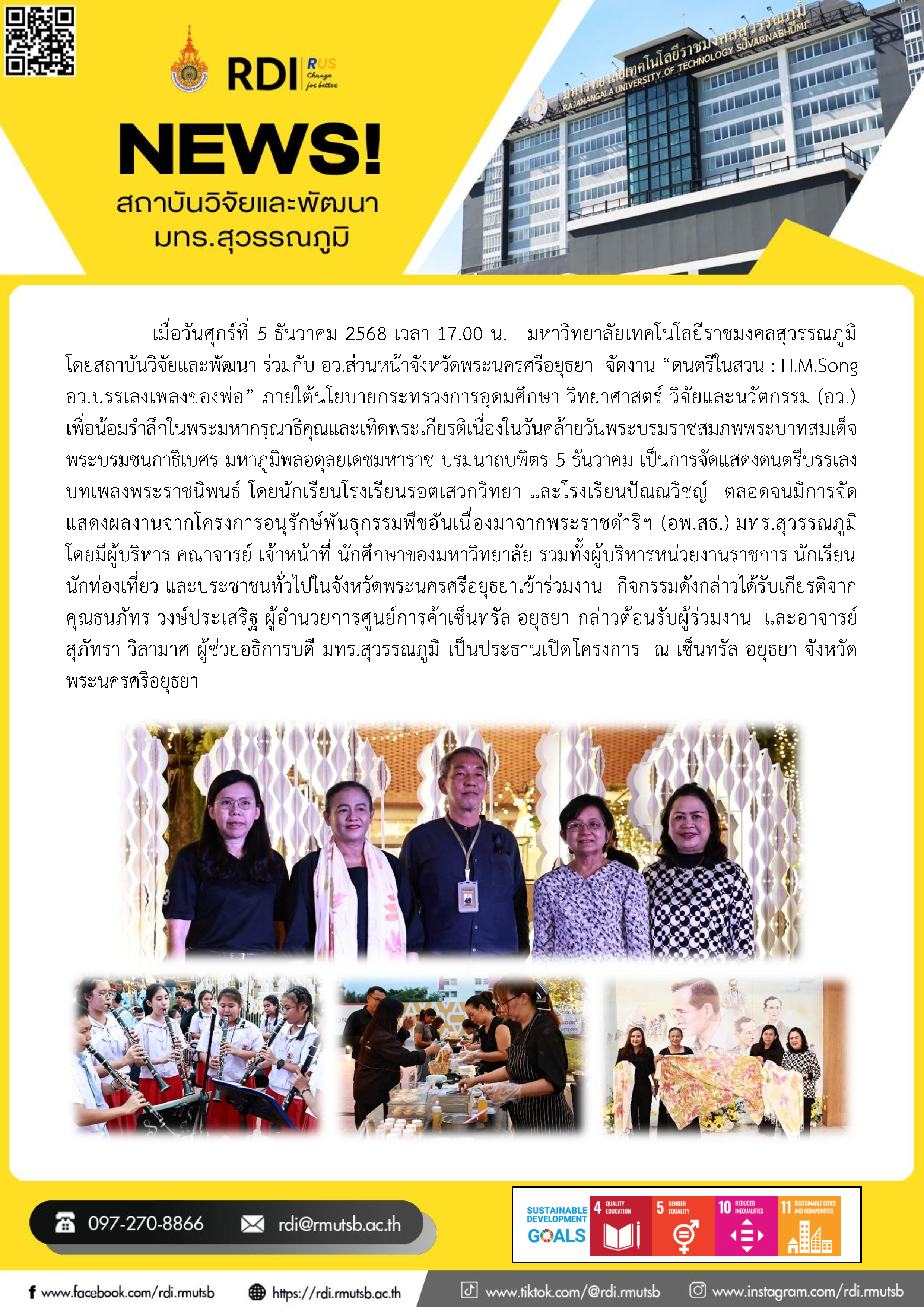 เมื่อวันศุกร์ที่ 5 ธันวาคม 2568 เวลา 17.00 น. มหาวิทยาลัยเทคโนโลยีราชมงคลสุวรรณภูมิ โดยสถาบันวิจัยและพัฒนา ร่วมกับ อว.ส่วนหน้าจังหวัดพระนครศรีอยุธยา จัดงาน “ดนตรีในสวน : H.M.Song อว.บรรเลงเพลงของพ่อ” ภายใต้นโยบายกระทรวงการอุดมศึกษา วิทยาศาสตร์ วิจัยและนวัตกรรม (อว.) เพื่อน้อมรำลึกในพระมหากรุณาธิคุณและเทิดพระเกียรติเนื่องในวันคล้ายวันพระบรมราชสมภพพระบาทสมเด็จพระบรมชนกาธิเบศร มหาภูมิพลอดุลยเดชมหาราช บรมนาถบพิตร 5 ธันวาคม เป็นการจัดแสดงดนตรีบรรเลงบทเพลงพระราชนิพนธ์ โดยนักเรียนโรงเรียนรอตเสวกวิทยา และโรงเรียนปัณณวิชญ์ ตลอดจนมีการจัดแสดงผลงานจากโครงการอนุรักษ์พันธุกรรมพืชอันเนื่องมาจากพระราชดำริฯ (อพ.สธ.) มทร.สุวรรณภูมิ โดยมีผู้บริหาร คณาจารย์ เจ้าหน้าที่ นักศึกษาของมหาวิทยาลัย รวมทั้งผู้บริหารหน่วยงานราชการ นักเรียน นักท่องเที่ยว และประชาชนทั่วไปในจังหวัดพระนครศรีอยุธยาเข้าร่วมงาน กิจกรรมดังกล่าวได้รับเกียรติจาก คุณธนภัทร วงษ์ประเสริฐ ผู้อำนวยการศูนย์การค้าเซ็นทรัล อยุธยา กล่าวต้อนรับผู้ร่วมงาน และอาจารย์สุภัทรา วิลามาศ ผู้ช่วยอธิการบดี มทร.สุวรรณภูมิ เป็นประธานเปิดโครงการ ณ เซ็นทรัล อยุธยา จังหวัดพระนครศรีอยุธยา