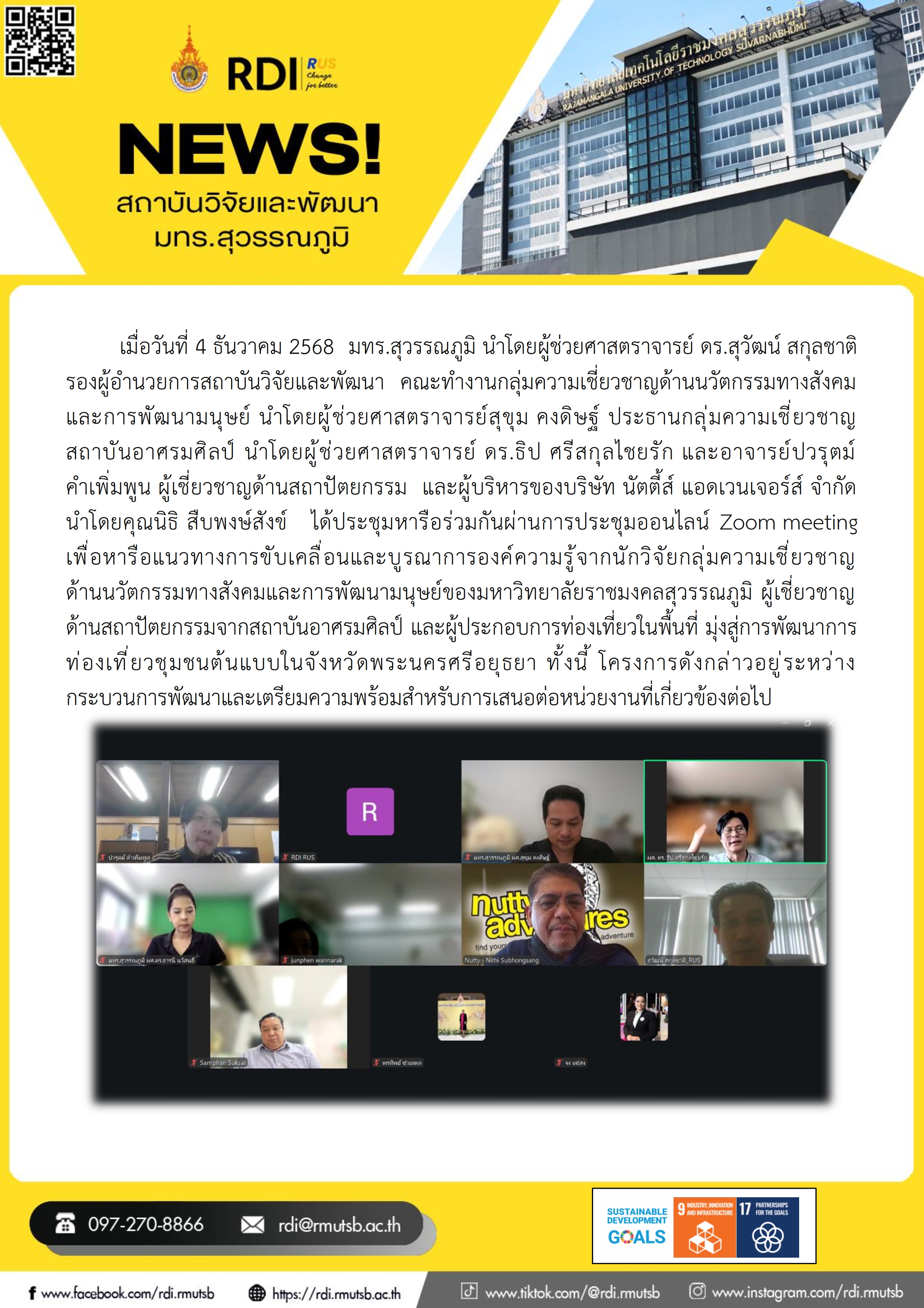 เมื่อวันที่ 4 ธันวาคม 2568 มทร.สุวรรณภูมิ นำโดยผู้ช่วยศาสตราจารย์ ดร.สุวัฒน์ สกุลชาติ รองผู้อำนวยการสถาบันวิจัยและพัฒนา คณะทำงานกลุ่มความเชี่ยวชาญด้านนวัตกรรมทางสังคมและการพัฒนามนุษย์ นำโดยผู้ช่วยศาสตราจารย์สุขุม คงดิษฐ์ ประธานกลุ่มความเชี่ยวชาญ สถาบันอาศรมศิลป์ นำโดยผู้ช่วยศาสตราจารย์ ดร.ธิป ศรีสกุลไชยรัก และอาจารย์ปวรุตม์ คำเพิ่มพูน ผู้เชี่ยวชาญด้านสถาปัตยกรรม และผู้บริหารของบริษัท นัตตี้ส์ แอดเวนเจอร์ส์ จำกัด นำโดยคุณนิธิ สืบพงษ์สังข์ ได้ประชุมหารือร่วมกันผ่านการประชุมออนไลน์ Zoom meeting เพื่อหารือแนวทางการขับเคลื่อนและบูรณาการองค์ความรู้จากนักวิจัยกลุ่มความเชี่ยวชาญด้านนวัตกรรมทางสังคมและการพัฒนามนุษย์ของมหาวิทยาลัยราชมงคลสุวรรณภูมิ ผู้เชี่ยวชาญด้านสถาปัตยกรรมจากสถาบันอาศรมศิลป์ และผู้ประกอบการท่องเที่ยวในพื้นที่ มุ่งสู่การพัฒนาการท่องเที่ยวชุมชนต้นแบบในจังหวัดพระนครศรีอยุธยา ทั้งนี้ โครงการดังกล่าวอยู่ระหว่างกระบวนการพัฒนาและเตรียมความพร้อมสำหรับการเสนอต่อหน่วยงานที่เกี่ยวข้องต่อไป