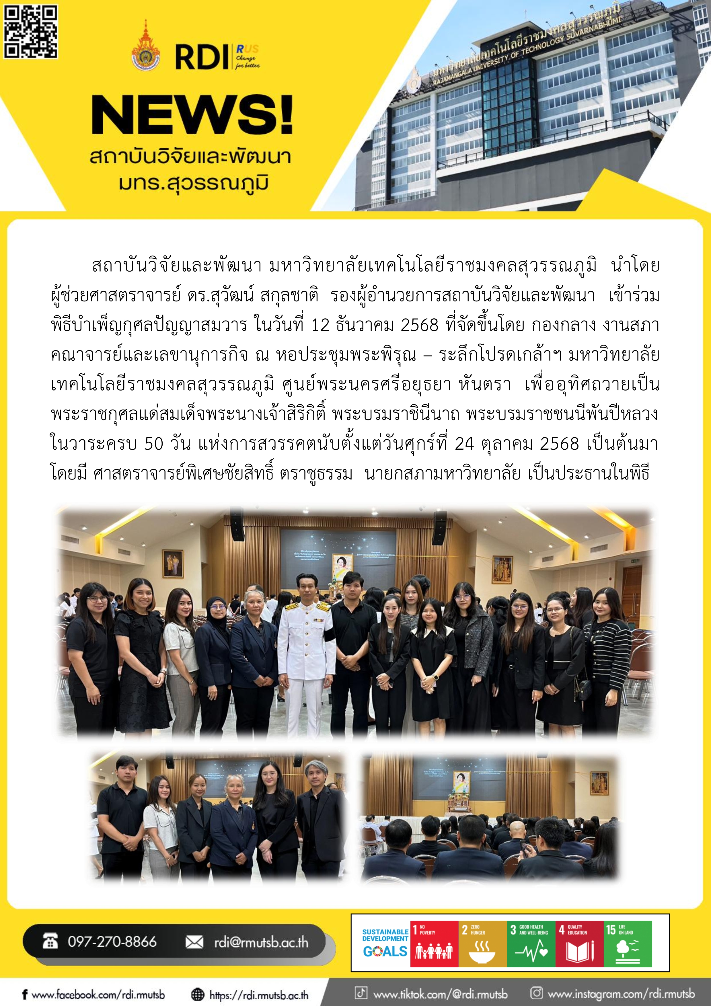 สถาบันวิจัยและพัฒนา มหาวิทยาลัยเทคโนโลยีราชมงคลสุวรรณภูมิ นำโดย ผู้ช่วยศาสตราจารย์ ดร.สุวัฒน์ สกุลชาติ รองผู้อำนวยการสถาบันวิจัยและพัฒนา เข้าร่วมพิธีบำเพ็ญกุศลปัญญาสมวาร ในวันที่ 12 ธันวาคม 2568 ที่จัดขึ้นโดย กองกลาง งานสภาคณาจารย์และเลขานุการกิจ ณ หอประชุมพระพิรุณ – ระลึกโปรดเกล้าฯ มหาวิทยาลัยเทคโนโลยีราชมงคลสุวรรณภูมิ ศูนย์พระนครศรีอยุธยา หันตรา เพื่ออุทิศถวายเป็นพระราชกุศลแด่สมเด็จพระนางเจ้าสิริกิติ์ พระบรมราชินีนาถ พระบรมราชชนนีพันปีหลวงในวาระครบ 50 วัน แห่งการสวรรคตนับตั้งแต่วันศุกร์ที่ 24 ตุลาคม 2568 เป็นต้นมา โดยมี ศาสตราจารย์พิเศษชัยสิทธิ์ ตราชูธรรม นายกสภามหาวิทยาลัย เป็นประธานในพิธี