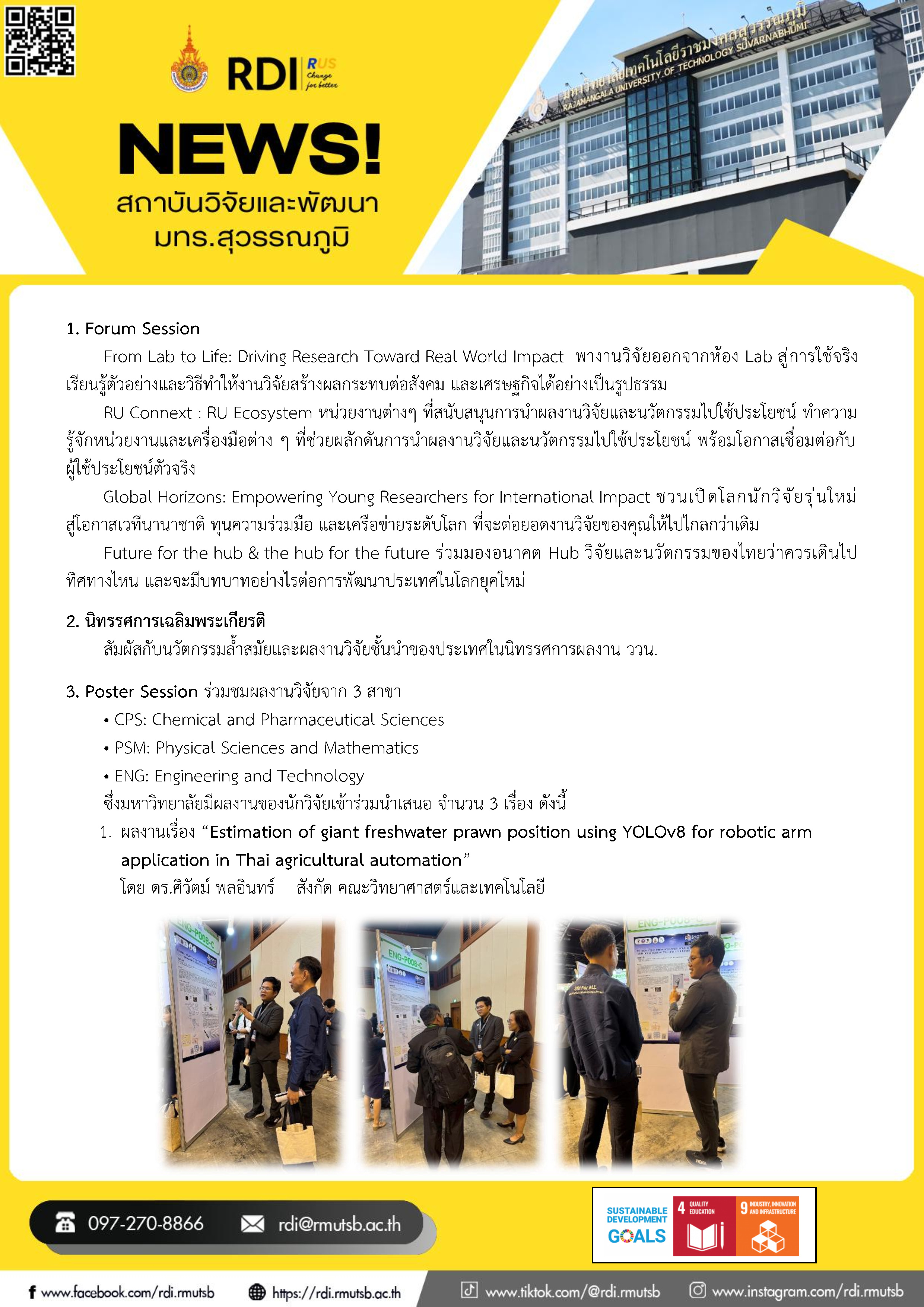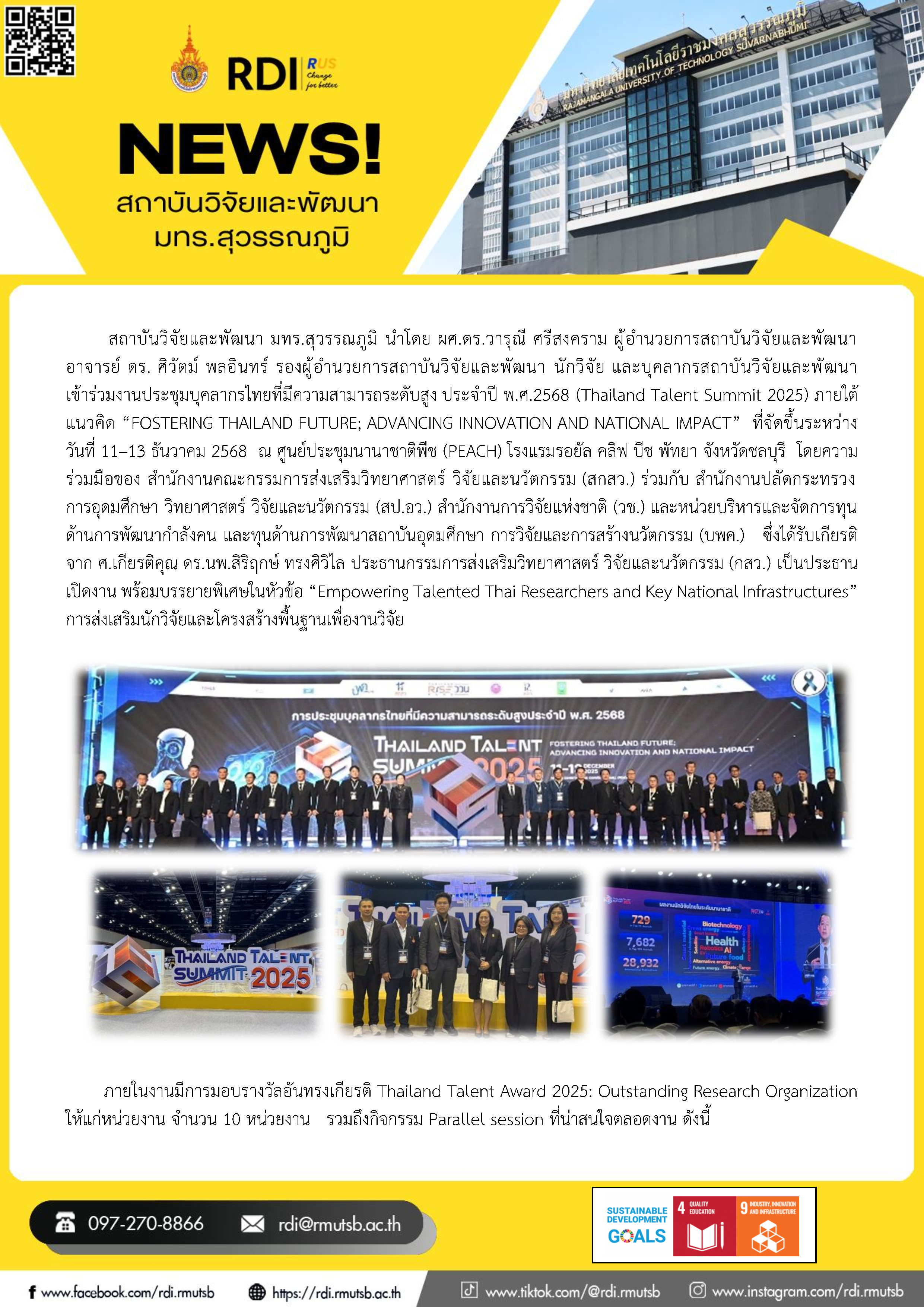 สถาบันวิจัยและพัฒนา มทร.สุวรรณภูมิ นำโดย ผศ.ดร.วารุณี ศรีสงคราม ผู้อำนวยการสถาบันวิจัยและพัฒนา อาจารย์ ดร. ศิวัตม์ พลอินทร์ รองผู้อำนวยการสถาบันวิจัยและพัฒนา นักวิจัย และบุคลากรสถาบันวิจัยและพัฒนา เข้าร่วมงานประชุมบุคลากรไทยที่มีความสามารถระดับสูง ประจำปี พ.ศ.2568 (Thailand Talent Summit 2025) ภายใต้แนวคิด “FOSTERING THAILAND FUTURE; ADVANCING INNOVATION AND NATIONAL IMPACT” ที่จัดขึ้นระหว่างวันที่ 11–13 ธันวาคม 2568 ณ ศูนย์ประชุมนานาชาติพีช (PEACH) โรงแรมรอยัล คลิฟ บีช พัทยา จังหวัดชลบุรี โดยความร่วมมือของ สำนักงานคณะกรรมการส่งเสริมวิทยาศาสตร์ วิจัยและนวัตกรรม (สกสว.) ร่วมกับ สำนักงานปลัดกระทรวง การอุดมศึกษา วิทยาศาสตร์ วิจัยและนวัตกรรม (สป.อว.) สำนักงานการวิจัยแห่งชาติ (วช.) และหน่วยบริหารและจัดการทุนด้านการพัฒนากำลังคน และทุนด้านการพัฒนาสถาบันอุดมศึกษา การวิจัยและการสร้างนวัตกรรม (บพค.) ซึ่งได้รับเกียรติจาก ศ.เกียรติคุณ ดร.นพ.สิริฤกษ์ ทรงศิวิไล ประธานกรรมการส่งเสริมวิทยาศาสตร์ วิจัยและนวัตกรรม (กสว.) เป็นประธานเปิดงาน พร้อมบรรยายพิเศษในหัวข้อ “Empowering Talented Thai Researchers and Key National Infrastructures” การส่งเสริมนักวิจัยและโครงสร้างพื้นฐานเพื่องานวิจัย