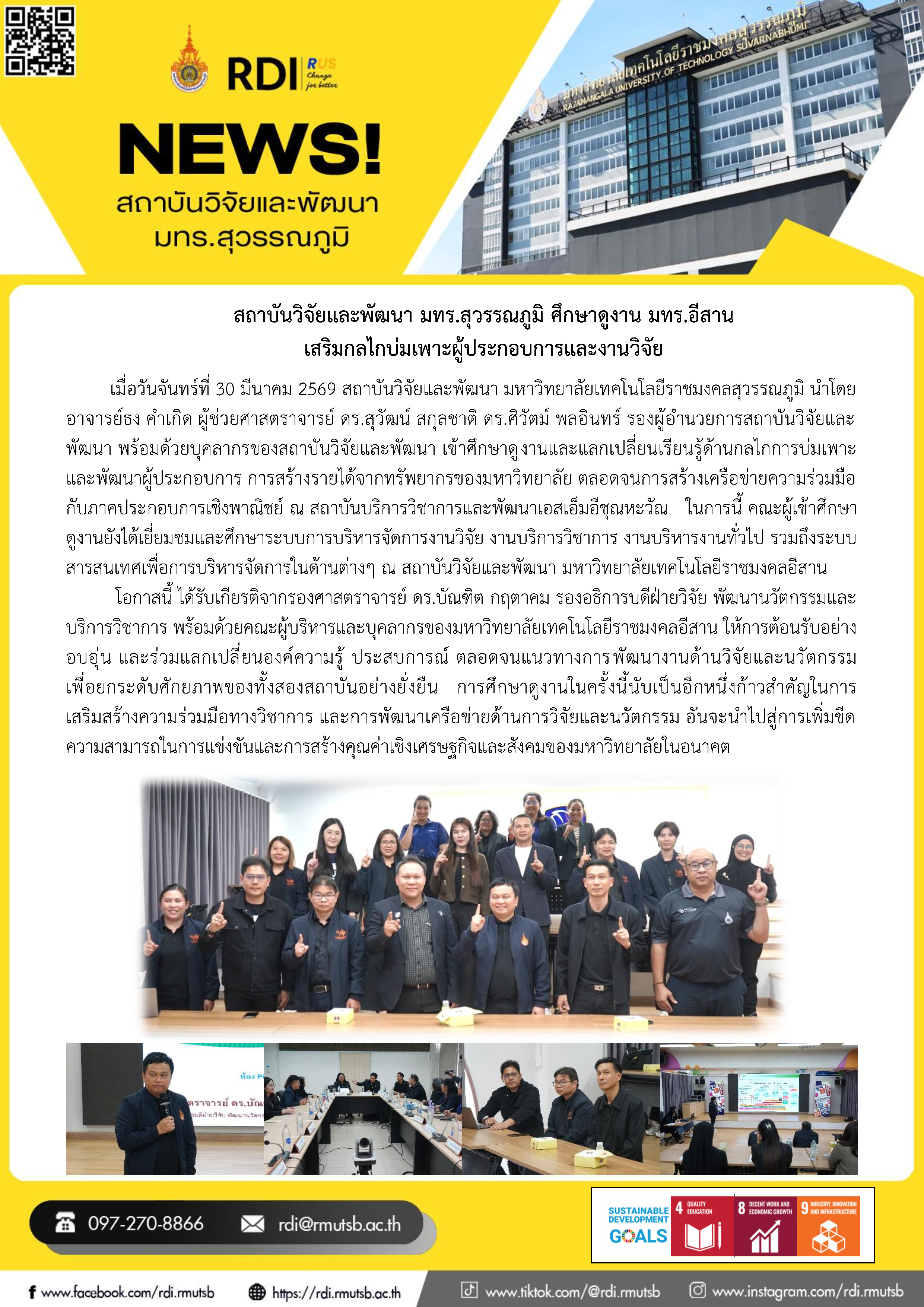 เมื่อวันจันทร์ที่ 30 มีนาคม 2569 สถาบันวิจัยและพัฒนา มหาวิทยาลัยเทคโนโลยีราชมงคลสุวรรณภูมิ นำโดย อาจารย์ธง คำเกิด ผู้ช่วยศาสตราจารย์ ดร.สุวัฒน์ สกุลชาติ ดร.ศิวัตม์ พลอินทร์ รองผู้อำนวยการสถาบันวิจัยและพัฒนา พร้อมด้วยบุคลากรของสถาบันวิจัยและพัฒนา เข้าศึกษาดูงานและแลกเปลี่ยนเรียนรู้ด้านกลไกการบ่มเพาะและพัฒนาผู้ประกอบการ การสร้างรายได้จากทรัพยากรของมหาวิทยาลัย ตลอดจนการสร้างเครือข่ายความร่วมมือกับภาคประกอบการเชิงพาณิชย์ ณ สถาบันบริการวิชาการและพัฒนาเอสเอ็มอีชุณหะวัณ ในการนี้ คณะผู้เข้าศึกษาดูงานยังได้เยี่ยมชมและศึกษาระบบการบริหารจัดการงานวิจัย งานบริการวิชาการ งานบริหารงานทั่วไป รวมถึงระบบสารสนเทศเพื่อการบริหารจัดการในด้านต่างๆ ณ สถาบันวิจัยและพัฒนา มหาวิทยาลัยเทคโนโลยีราชมงคลอีสาน
